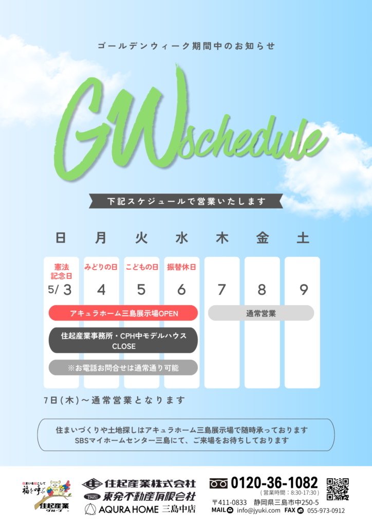 5/3(日)-6(水)は 住起産業株式会社の事務所およびCPH中モデルハウスはクローズとさせていただきます。