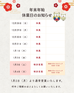 年末年始の休業日および特別営業日について、下記の通りご案内いたします。
